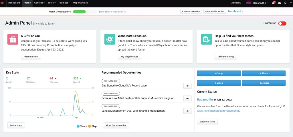 The data below, before I began using Reverbnation with the post/release of ‘My Daisy Brain’, shows an interest in downloading music from the site. Surprisingly the top one, at 764 downloads, is a cover I recorded of the Hendrix song ‘Angel’, which I did here in Plymouth over the last year or two. Other top ones are my cover of ‘Shine a Light’, by the Stones, as well as a couple of originals. Although the main purpose of the site is storytelling, it is interesting. I guess mechanical clearances with the copyright-holders would have to be made.
